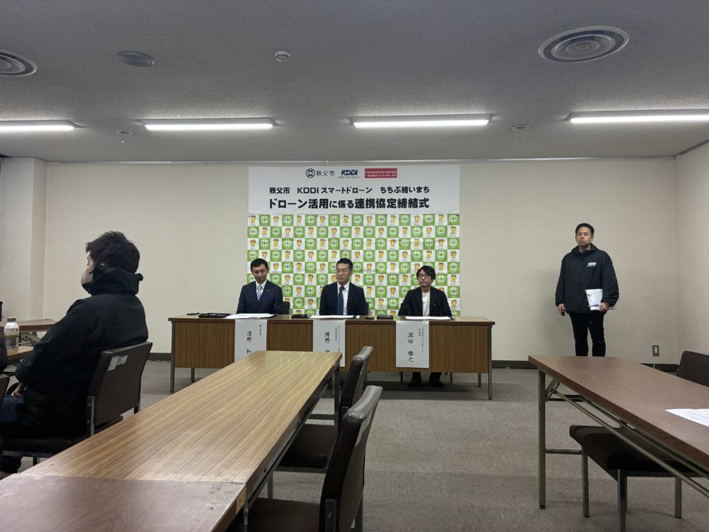 秩父市、KDDIスマートドローン株式会社、一般社団法人ちちぶ結いまちによる「ドローンを活用した秩父市の地域活性化」を目的とした連携協定締結式およびドローンデモンストレーションに参加いたしました。